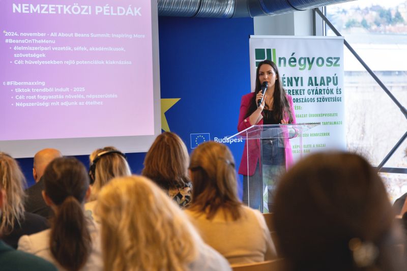 Magyarvári Szilvia, a NÉGYOSZ dietetikusa mutatta be az OkosFehérje projekt eredményeit, amely 2024 óta dolgozik a hüvelyesek népszerűsítésén.